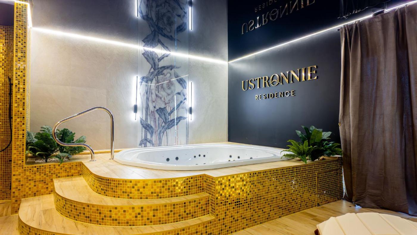 Zaplecze odnowy biologicznej obiektu Apartament 5 obejmuje saunę i wannę z hydromasażem.